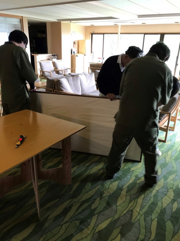 本日はお部屋の障子や襖の張替えを従業員一丸となって補修しております。