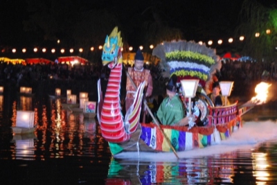 午後7時 南都楽所の奏する雅楽が流れるなか、花扇をはじめ、花扇使・ミスうねめ・ミス奈良を乗せた2隻の管絃船(龍頭・鷁首)が、猿沢池に浮かぶ40余りの流し灯籠の間をぬって池をめぐり、最後には花扇を池中に投じる雅やかな行事です。