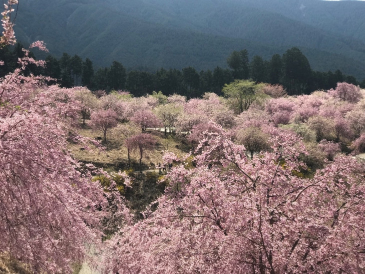1000本のしだれ桜と山々の絶景を楽しめる。