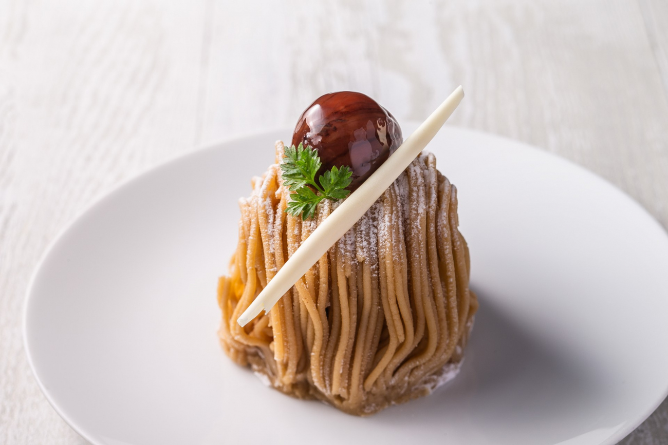 渋皮付きの甘露煮栗をまるごとトッピングしたモンブラン。口どけのよいマロンクリームと、やさしい甘さのホワイトチョコレートが織りなす、上質な味わい。深みと軽やかさを同時に楽しめる、贅沢なモンブランです。