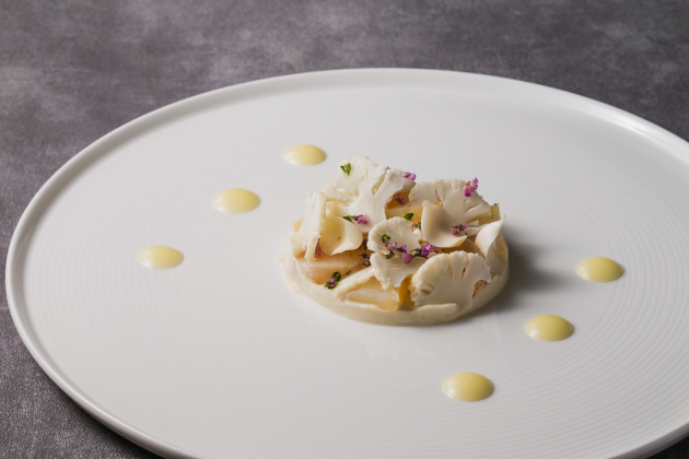カリフラワーとゆり根の異なる食感が楽しい『鯛の燻製とホタテ貝柱の炙り』から始まり、
