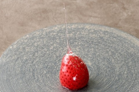 しずくのように繊細に伸びたフォルムが印象的ないちごのフルーツ飴。ぱりっとした歯ざわりのあとに、いちごのみずみずしさがふわりと広がります。人気のフルーツ飴をほろ苦いカラメルで仕上げることで、和と洋がほどよく溶け合う新しいスイーツになりました。