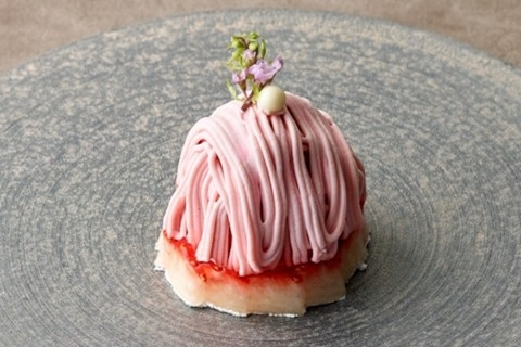 ココナッツメレンゲに、レアチーズといちごのムースを重ね、さらにルビーチョコレートのクリームを幾重にもあしらいました。周りにはスライスしたいちごを添え、真珠を思わせるシリアル入りホワイトチョコレートをアクセントに乗せました。