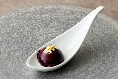 低温でじっくり火入れした伊勢どりに、生クリームとハーブを合わせてなめらかな一口ムースに仕上げました。ポルト酒のジュレでコーティングし、金箔をそっとあしらった、見た目も味わいも大人の一品です。
