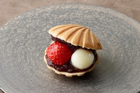 三重県産いちご「かおり野」をまるごと一粒包み込んだ、貝モチーフの最中です。やさしい甘さの粒あんに、いちご、真珠をイメージした白玉が並び、志摩ならではの物語を感じる和スイーツに仕上がりました。