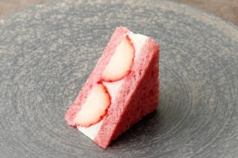 ラズベリーとビーツが練り込まれた、香り豊かな国産小麦パンで作ったフルーツサンド。真っ赤な外皮と白い果肉のコントラストが特徴の三重県産いちご「かおり野」ならではの、断面の美しさも楽しめるサンドウィッチです。