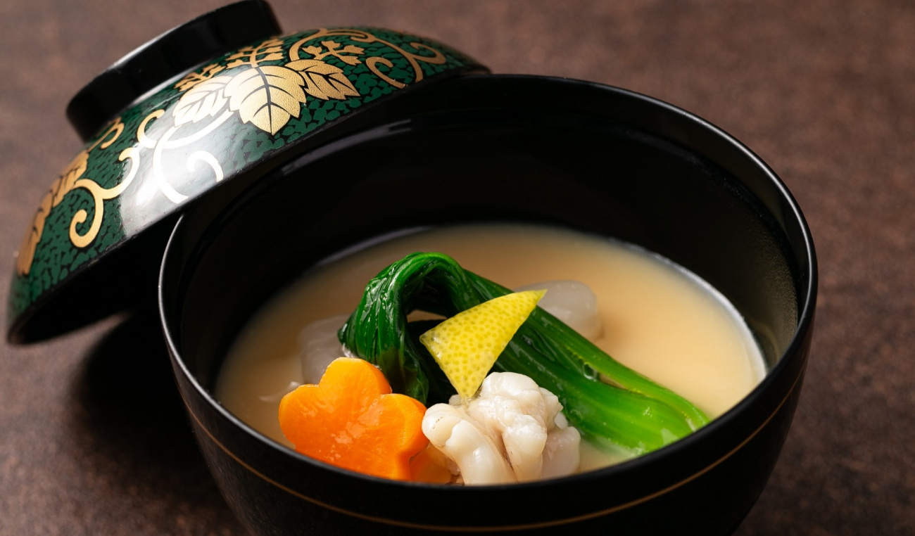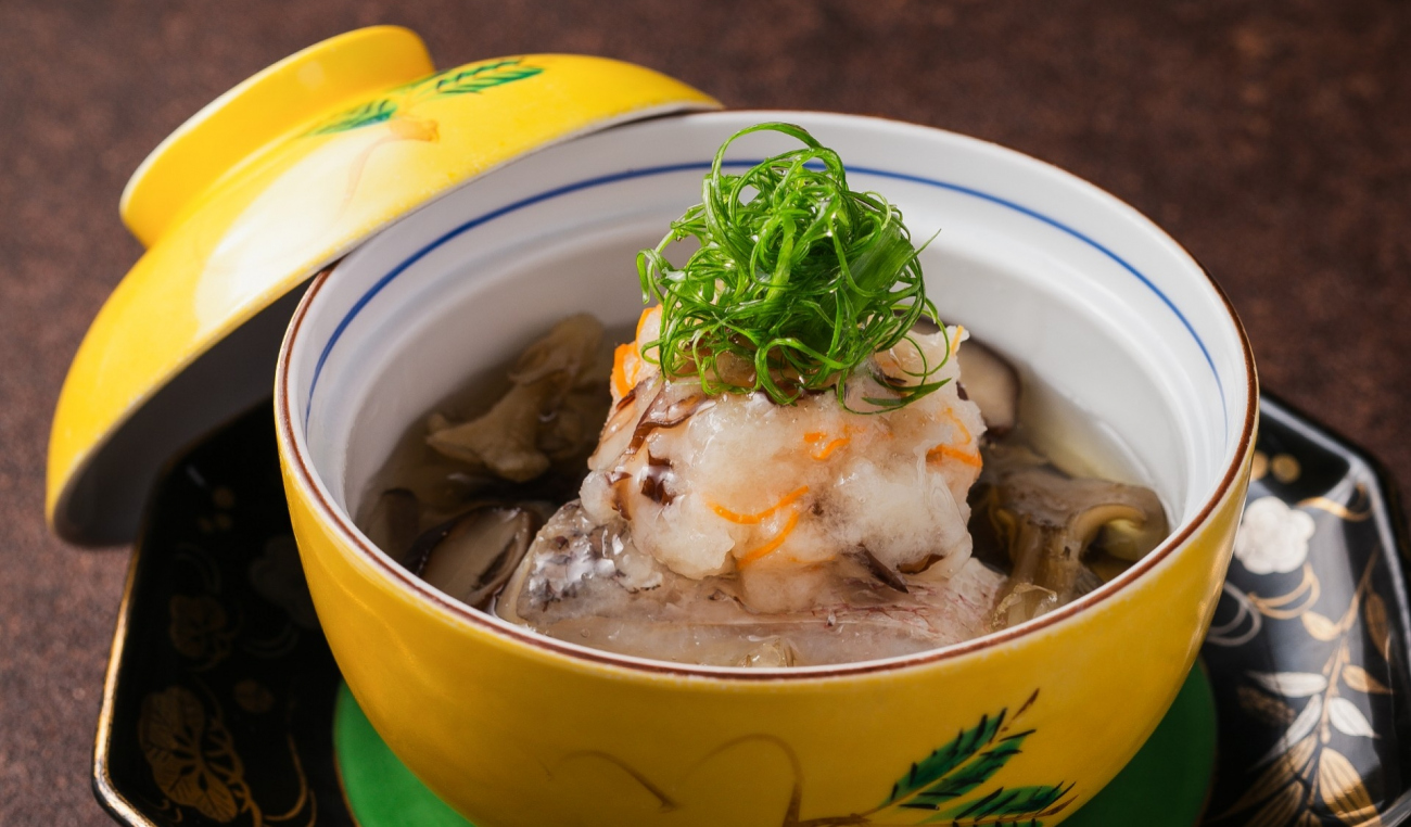 白い蕪を雪に見立て、ふっくらと蒸し上げた冬の京料理『甘鯛蕪蒸し きのこ餡掛け』。