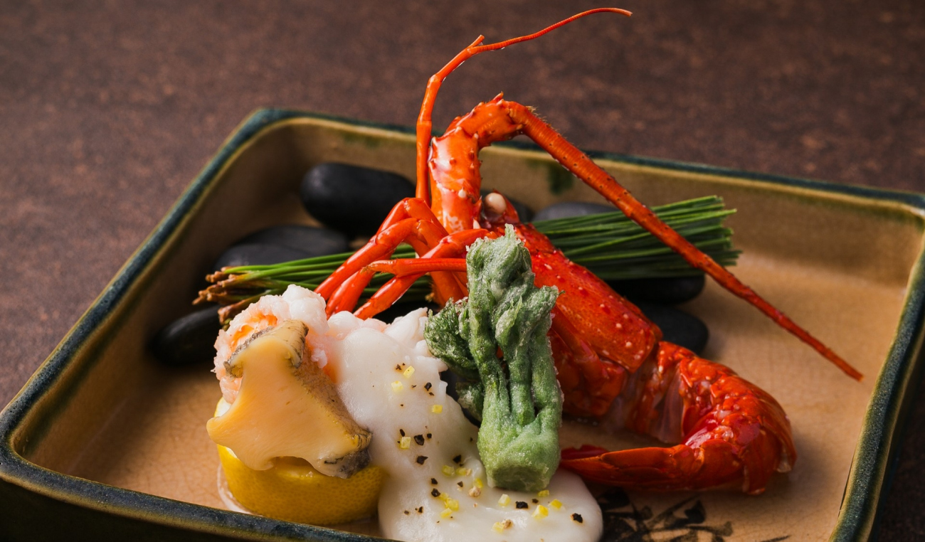 伊勢海老をまるごと一尾あしらった冬の露草コースは、