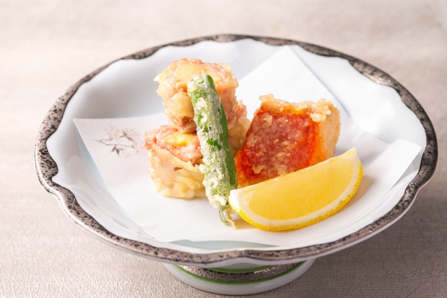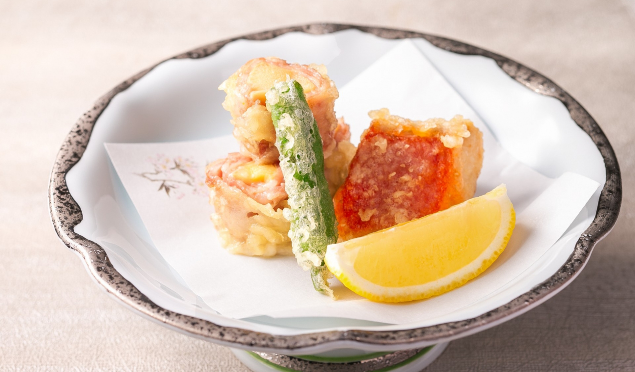 伊勢志摩のブランド豚「パールポーク」で包んだ筍と、脂の乗ったこの時期の金目鯛の揚物など、