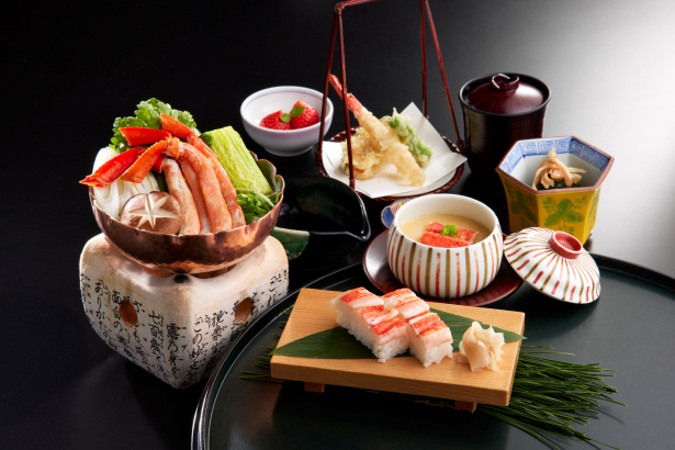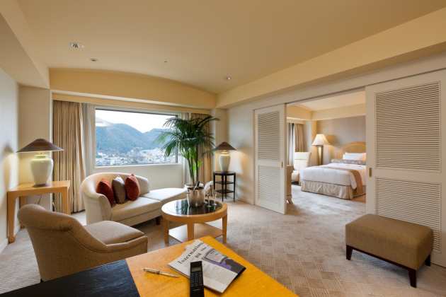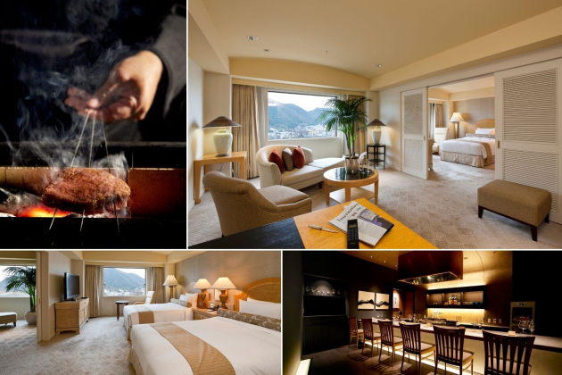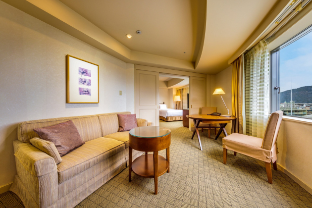 ホテル最上位の75㎡「ロイヤルスイート」での滞在に加え、1日1組限定の館内レストラン「炭火割烹 いのくち」でのディナーをご用意。翌日の朝食はホテル最上階「エステラ」にて、お二人だけのプライベート貸切朝食をお愉しみいただけます。