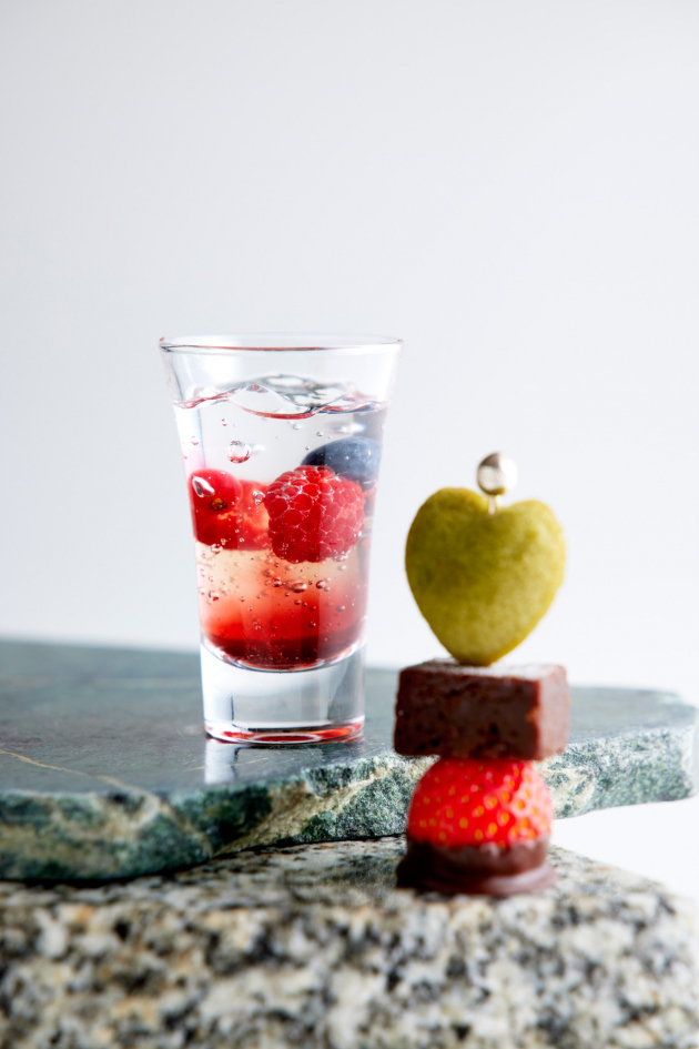 旬の苺をダークチョコレートでコーティングし、テリーヌショコラと抹茶フィナンシェを合わせたピンチョスにしました。苺から順においしく召し上がれるよう工夫しています。