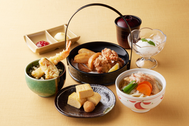 若竹 | 出汁巻き玉子/鶏唐揚げ/きつねうどん(温 又は 冷)/ミニ海老天丼/赤出汁/バニラアイスクリーム |