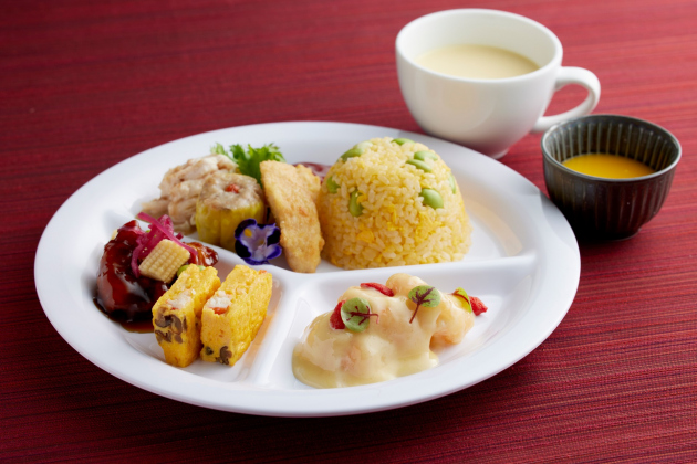 キッズプレート | コーンスープ/焼売/唐揚げ/ほぐし鶏/かに玉/エビのマヨネーズソース/黒酢酢豚/炒飯/胡麻団子/マンゴープリン |