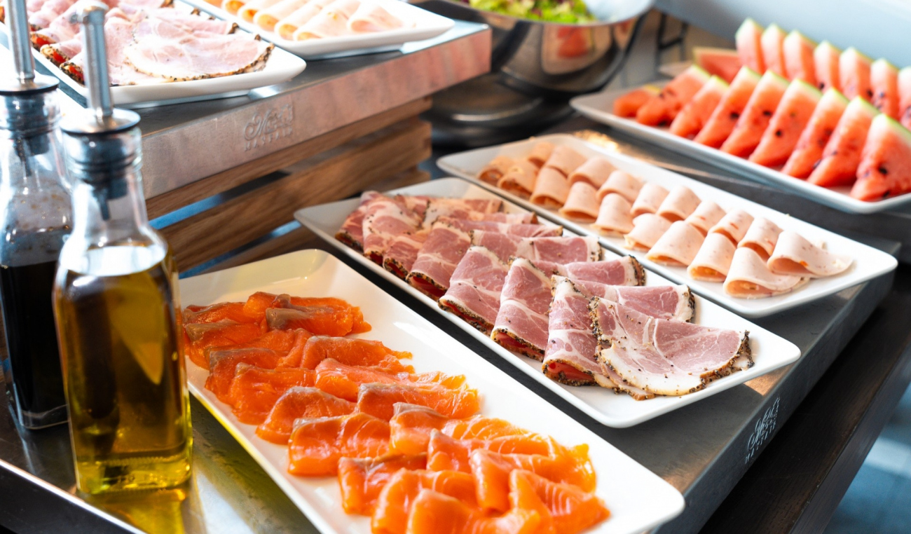 ソーセージ/スクランブルエッグ/フライドエッグ/サラダバー/日替わりスープ/スモークサーモン/モルタデッラ/パン各種