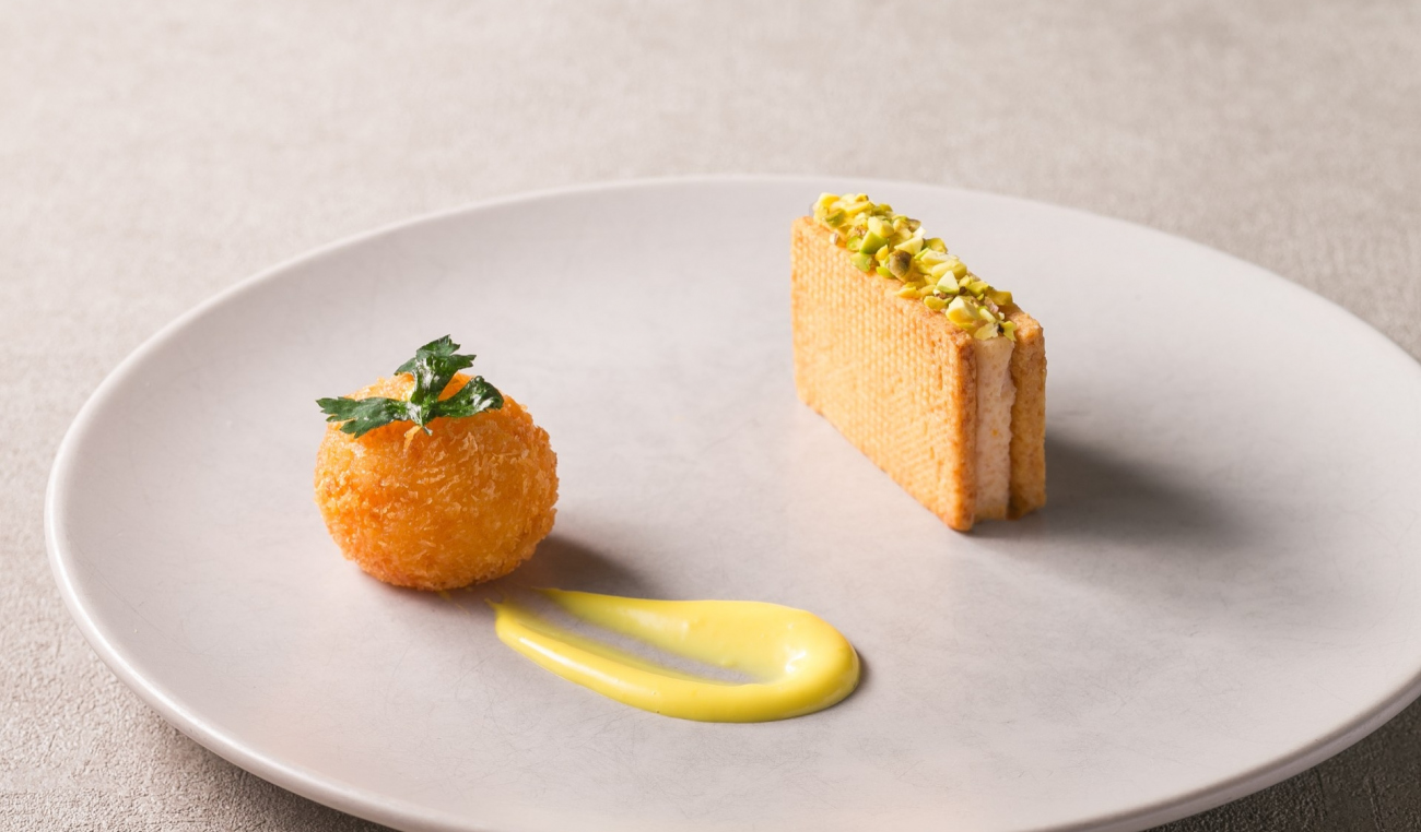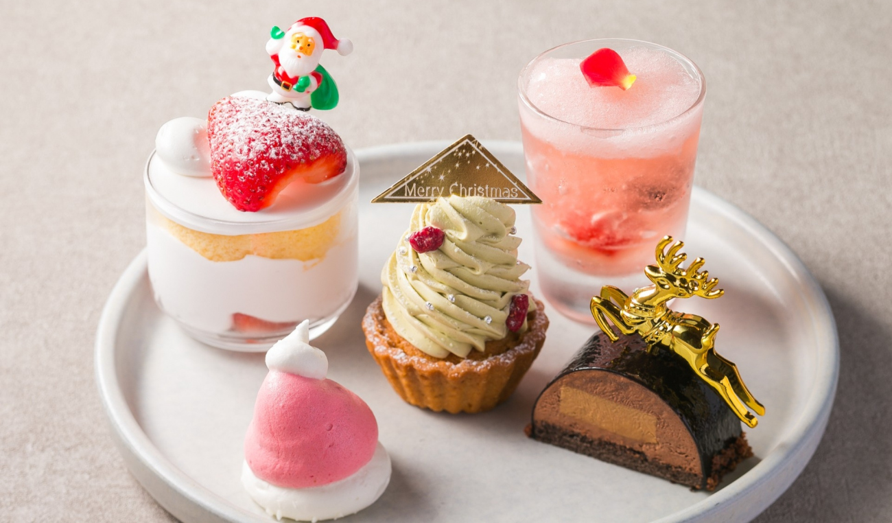 食欲をそそる香ばしさと軽やかな食感が魅力の2種のアミューズ、さっぱりとした香りの前菜、寒い冬にぴったりなオニオングラタンスープとお楽しみいただいた後は、金目鯛のバプールと牛フィレ肉のロティのWメイン、食後にはクリスマスを賑やかに彩る5種のスイーツを盛り合わせにしてお持ちいたします。