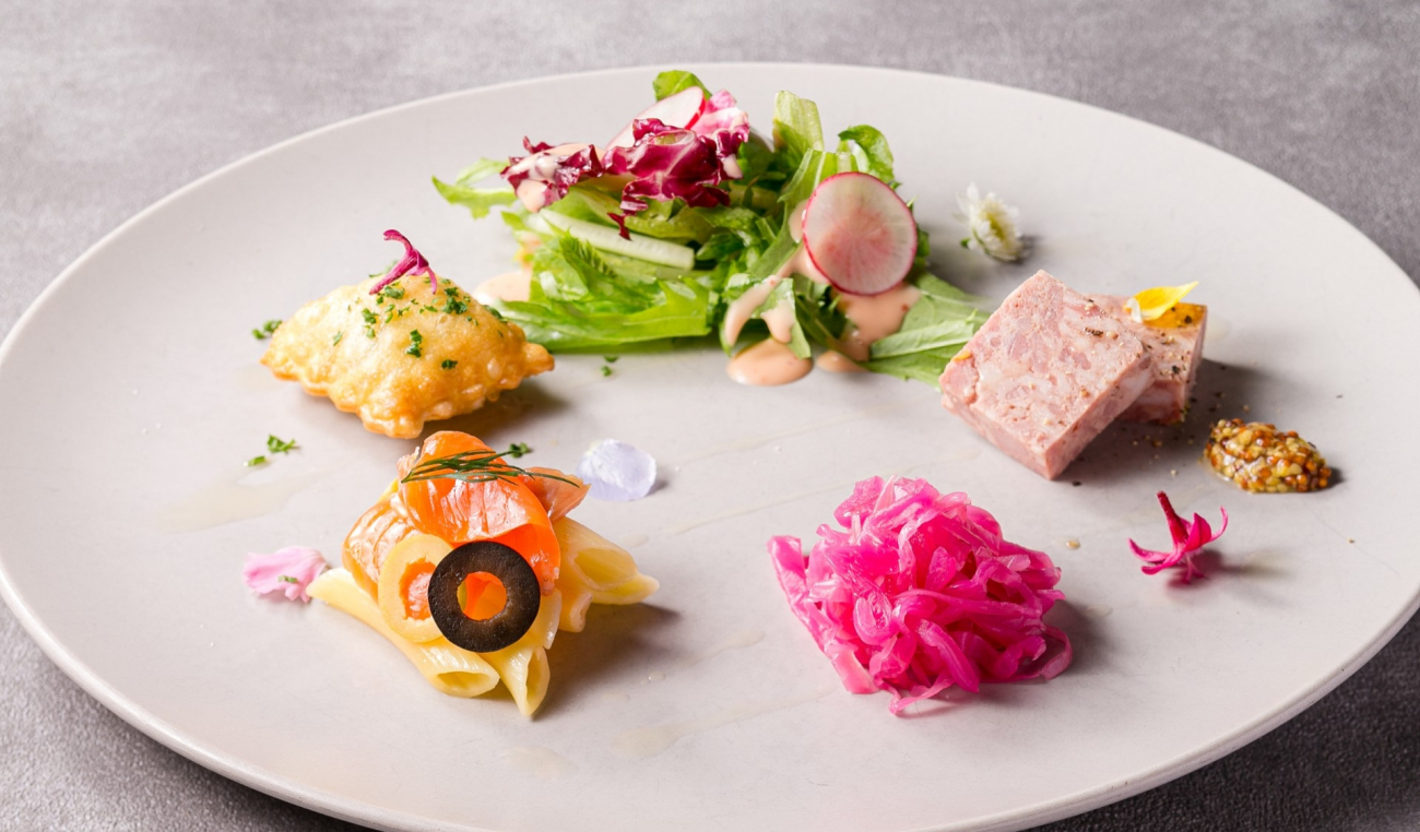 彩りゆたかな5種類の前菜の盛り合わせ、カリフラワーのブルーテをお楽しみいただいたあとは、