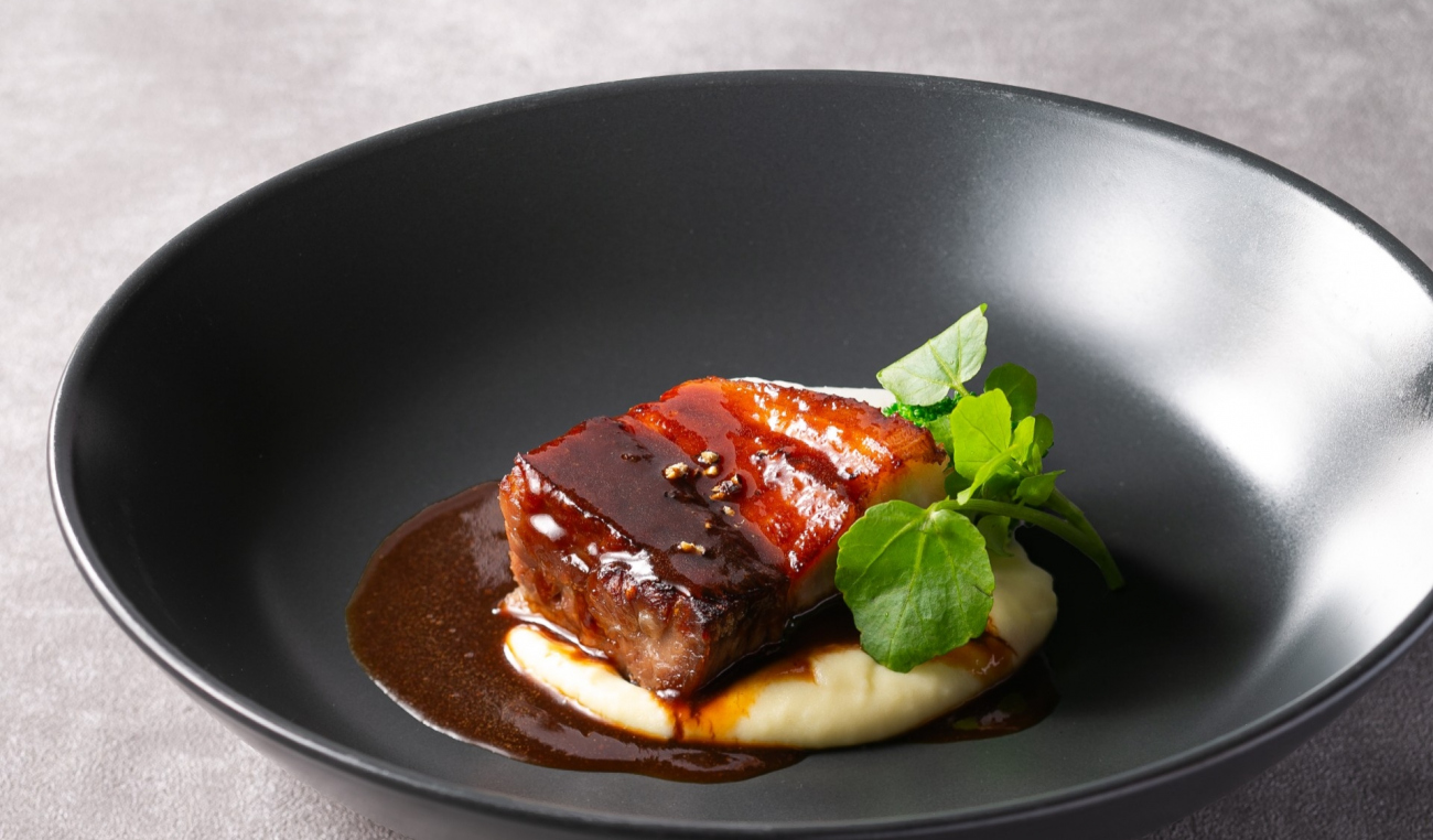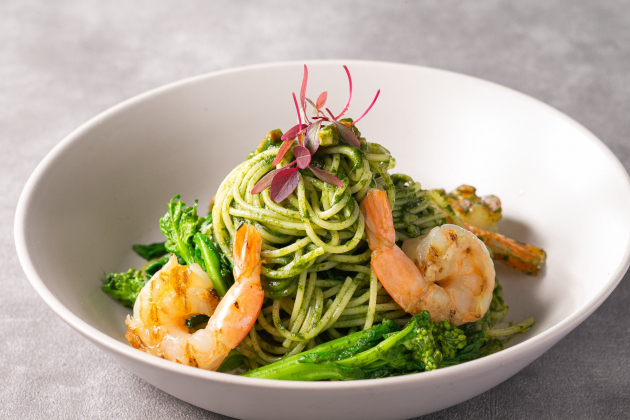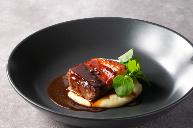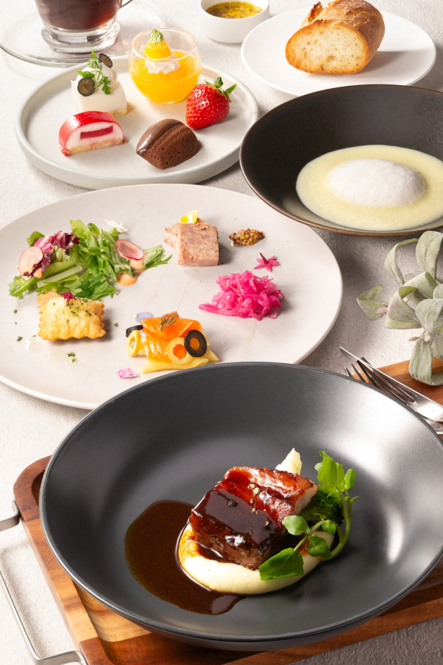 メイン料理を【豚バラ肉のコンフィ アニス】または【小海老と菜花のオイルパスタ】から1品お選びいただけます。