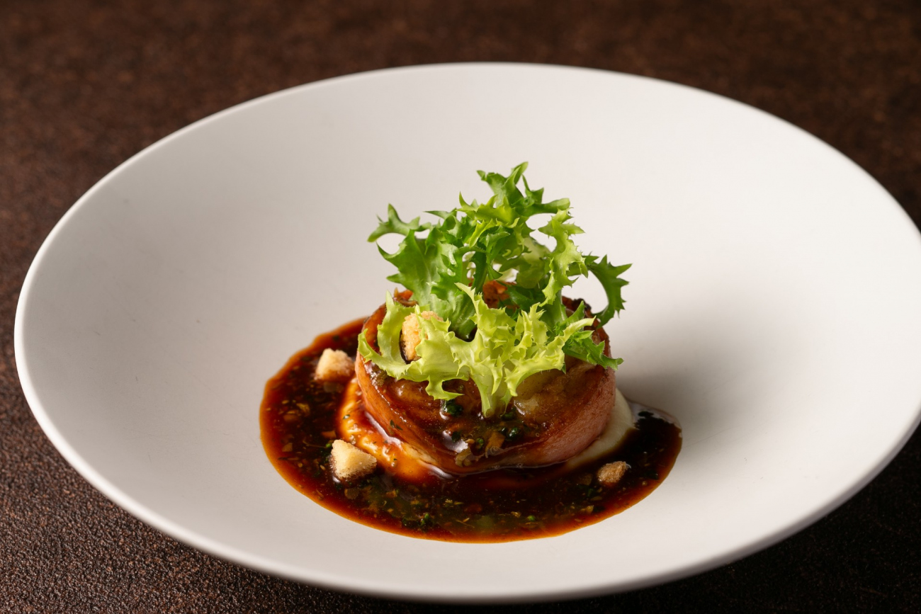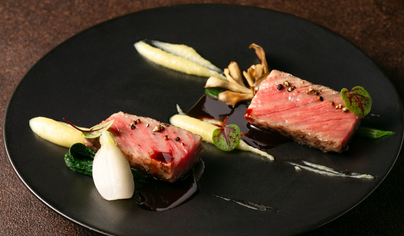華やかなアミューズと前菜で始まり、香ばしく焼き上げたアンコウのムニエルと、旨味が溢れる博多和牛ロースのグリエと続く