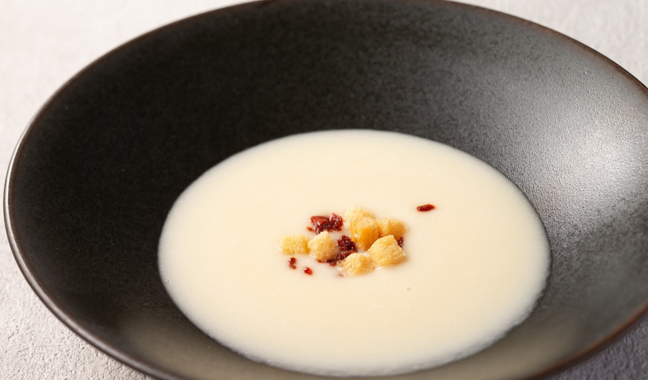 人参のピューレと酸味のあるソースを組み合わせたホタテのグリエと優しい甘みをもった玉葱のブルーテを組み込んだ満足感のあるランチコース。