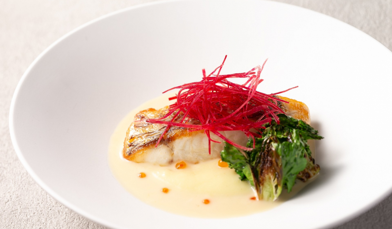 ホタテのグリエや玉葱のブルーテなどの前菜とスープをお楽しみいただいたあとに、鯛のポワレ&鴨胸肉のローストのWメインが楽しめるランチコース。