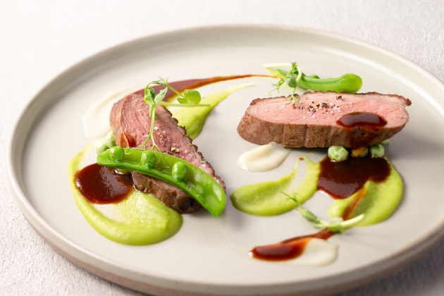 ・鴨胸肉のローストプティポワのピューレとソースポワブラード