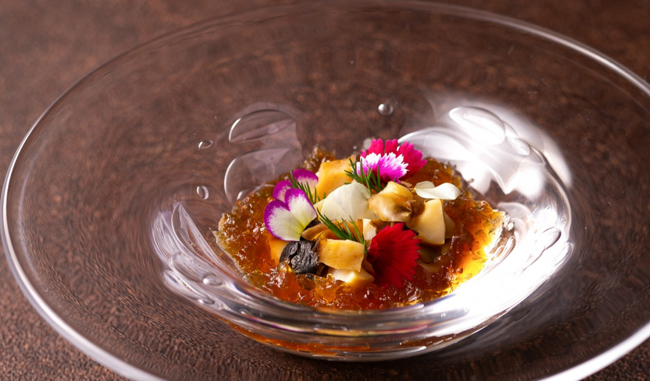 2種のアミューズと前菜につづいて、スペシャリテにはオマール海老のジュレと磯の香り豊かな栄螺のマリネ。