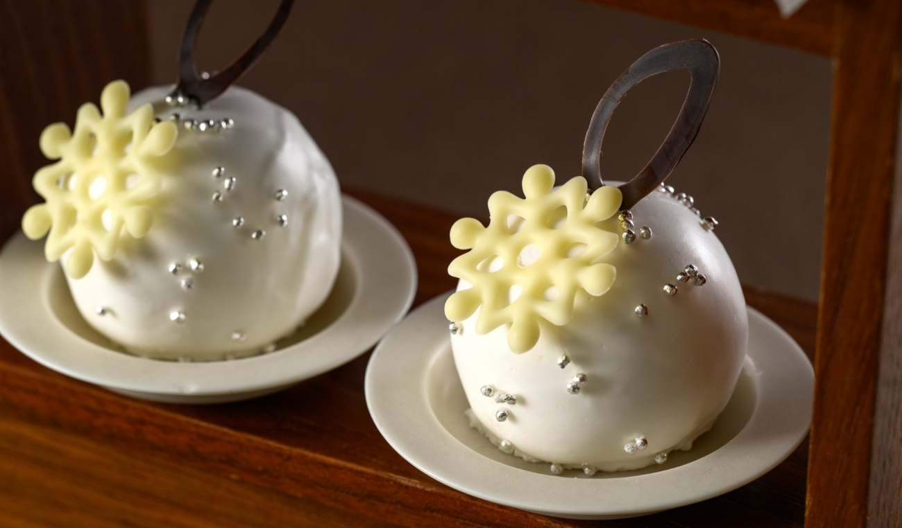 ◆オーナメントムース:雪のオーナメントを思わせる真っ白なムースの中に、甘酸っぱいベリーのムースを閉じ込めました。