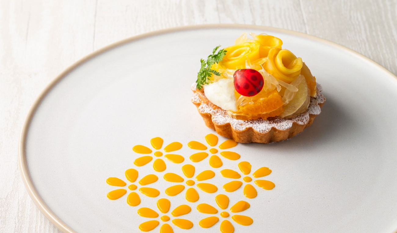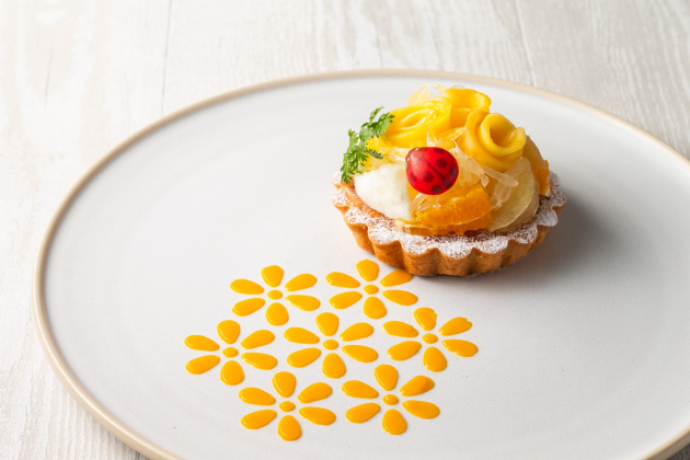 明るさや幸せの象徴とされる黄色のフルーツを使用した華やかなタルト。マンゴーの甘みと柑橘の酸味の調和を楽しめる一品です。