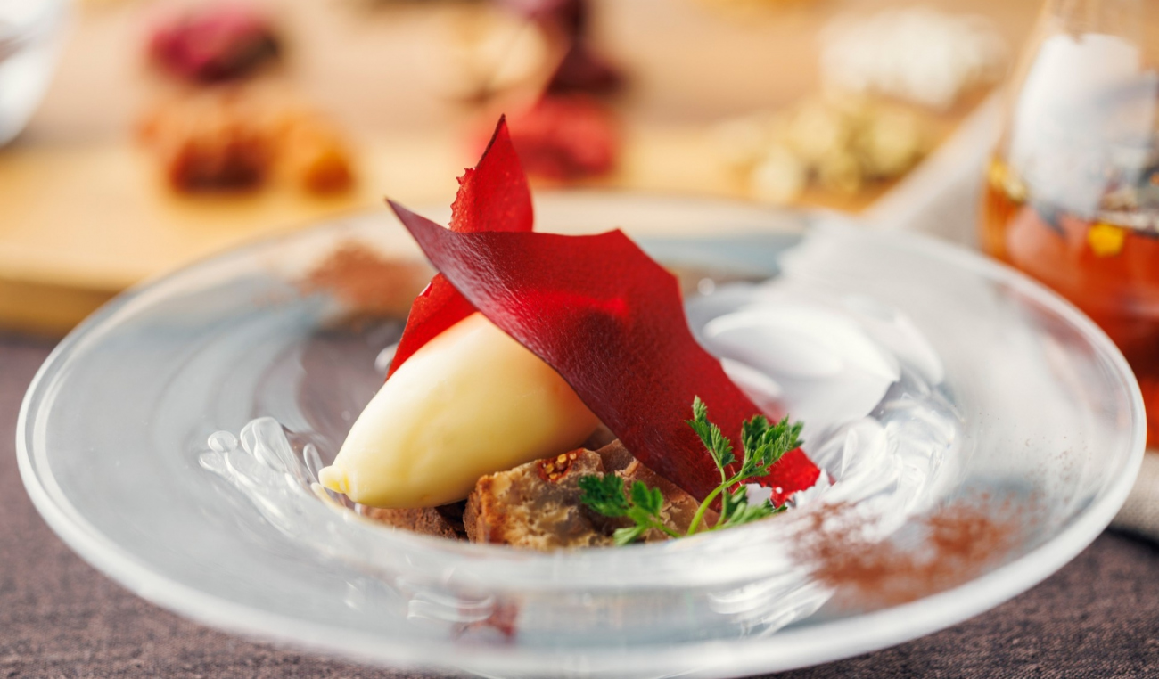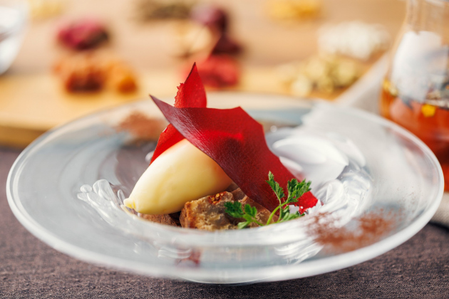 棗や竜眼肉、甘草などの生薬を使用し、素材本来の優しい甘みを活かして焼き上げました。トンカ豆の香り豊かなアイスクリームとビーツのチュイルを添え、味わいと食感のアクセントをプラス。身体への優しさにも配慮し、漢方茶とともに心身を整えるひとときに寄り添う一品です。