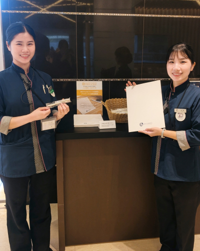 環境への配慮という点で言えば、私たちのホテルではペットボトルの使用を最小限に抑えるReduce(リデュース)への取組みとして、ウォーターサーバーの導入やマグボトルの使用を推進しています。以前は、988室ある客室すべてにご滞在人数分のミネラルウォーターを準備していたため、1日で2千本以上、年間約7万本を消費していましたが、現在はペットボトルの消費を抑えることで環境負荷の少ないホテルを目指しています。 その普及活動のため、ホテルオリジナルデザインのマグボトルも作り、フロントで販売しています。京都をイメージしたシンプルで可愛らしいデザインが海外からのお客様にも好評で、お土産にお買い求めいただくことも増えました。こういった活動に国内外問わず賛同いただけるのは、とても喜ばしいことだと思っています。最近では、感染症対策の役割を終えた透明アクリル板をアップサイクルし、コースター作りも行いました。今後もさまざまな取組みを通じ、ひと・地域・地球とつながるSDGsなホテルであり続けたいと考えています。