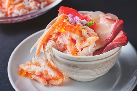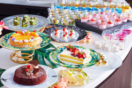 ブッフェメニュー キャビアとクリームチーズ/北海道産帆立のカクテル/海鮮丼/カニと海老のちらし寿司/カニサラダ/カニ甲羅グラタン/カニ焼売/カニコロッケ/海老とカニ爪の天ぷら 抹茶塩/ローストビーフ トリュフソース/ローストチキン シャリアピンソース/オペラ/ガトーショコラ/ベリーロール/アイス など