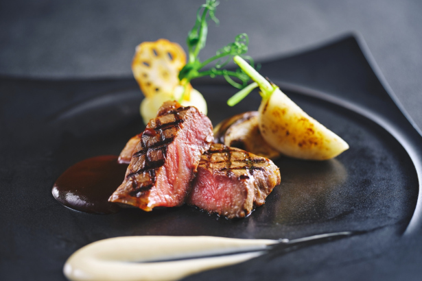 国産牛ロースのグリエ トリュフ風味の赤ワインソースと柚子胡椒香る和風ソース +1,500円