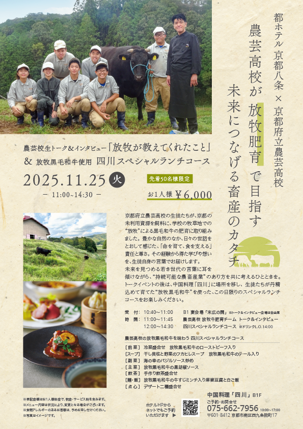 未来を見つめる若き世代の言葉に耳を傾けながら、“持続可能な農畜産業”のあり方を共に考えるひとときを。トークイベントの後は、中国料理「四川」に場所を移し、 生徒たちが丹精込めて育てた“放牧黒毛和牛”を使った、この日限りのスペシャルランチコースをお楽しみください。