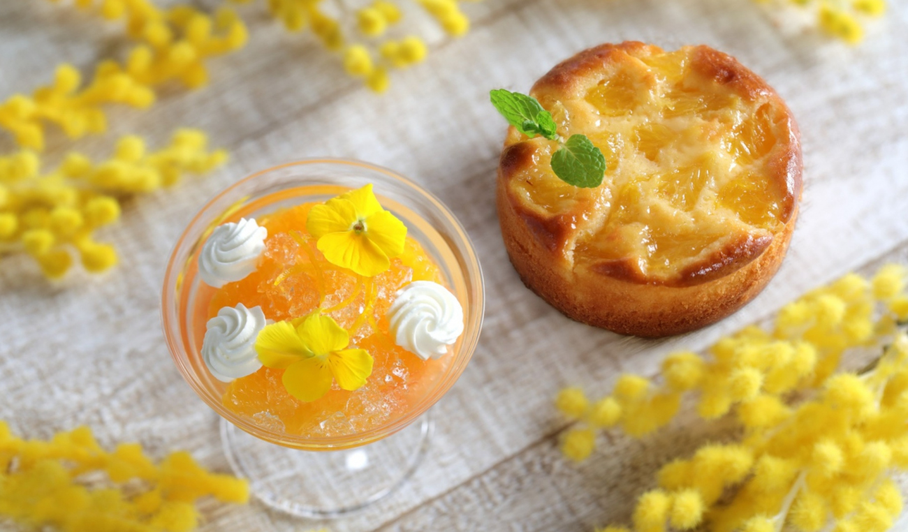 パンナコッタ、みかんのブリュレ、オレンジやグレープフルーツをたっぷり入れたカルダモンフレーバーのジュレを層にし、ビタミンカラーのエディブルフラワーを飾りました。