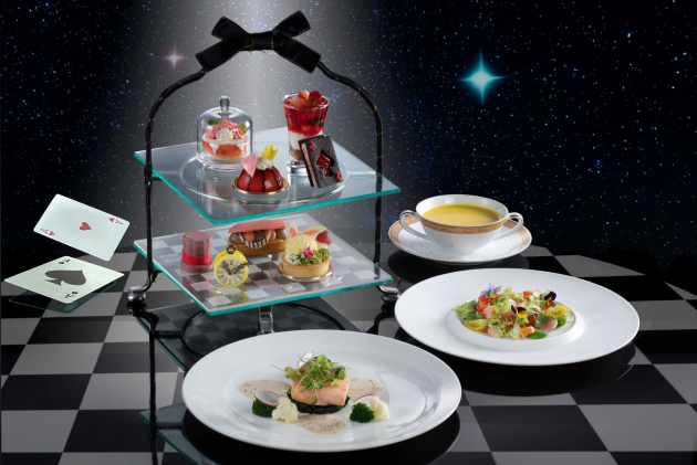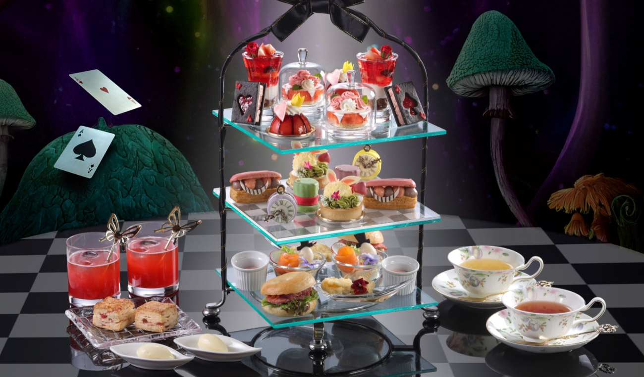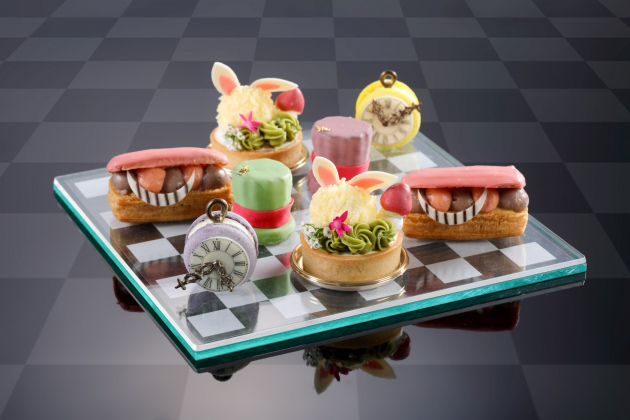白うさぎ、チェシャ猫、ハートの女王、ハンプティ・ダンプティなどをモチーフにしたスイーツとセイボリーをティースタンドに飾り、「不思議の国のアリス」の世界観を表現しました。旬のいちごをふんだんに使用した色鮮やかなアフタヌーンティーです。