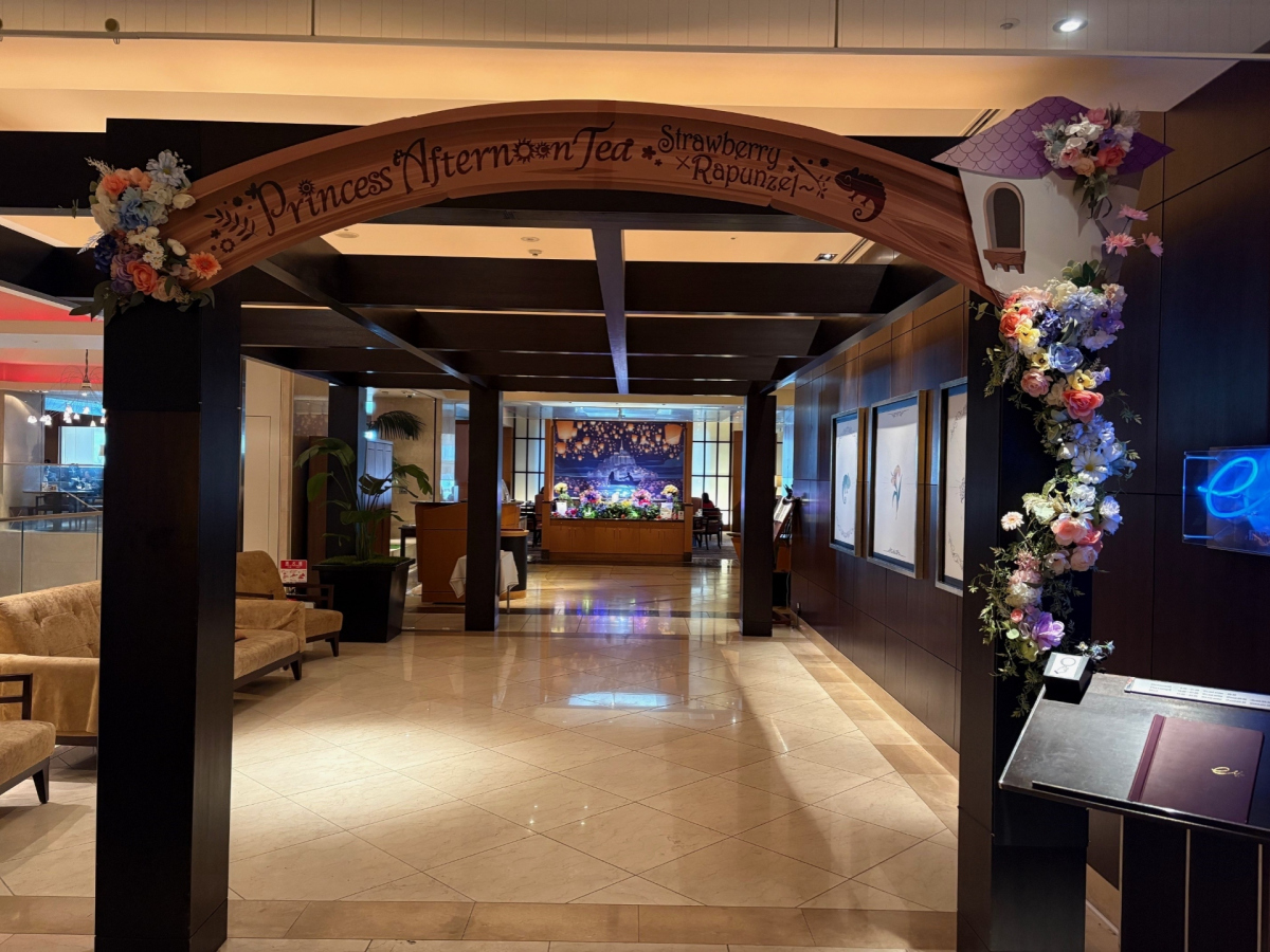 レストランのエントランスから店内にかけて、「ラプンツェル」の世界観を表現した装飾を施しています。