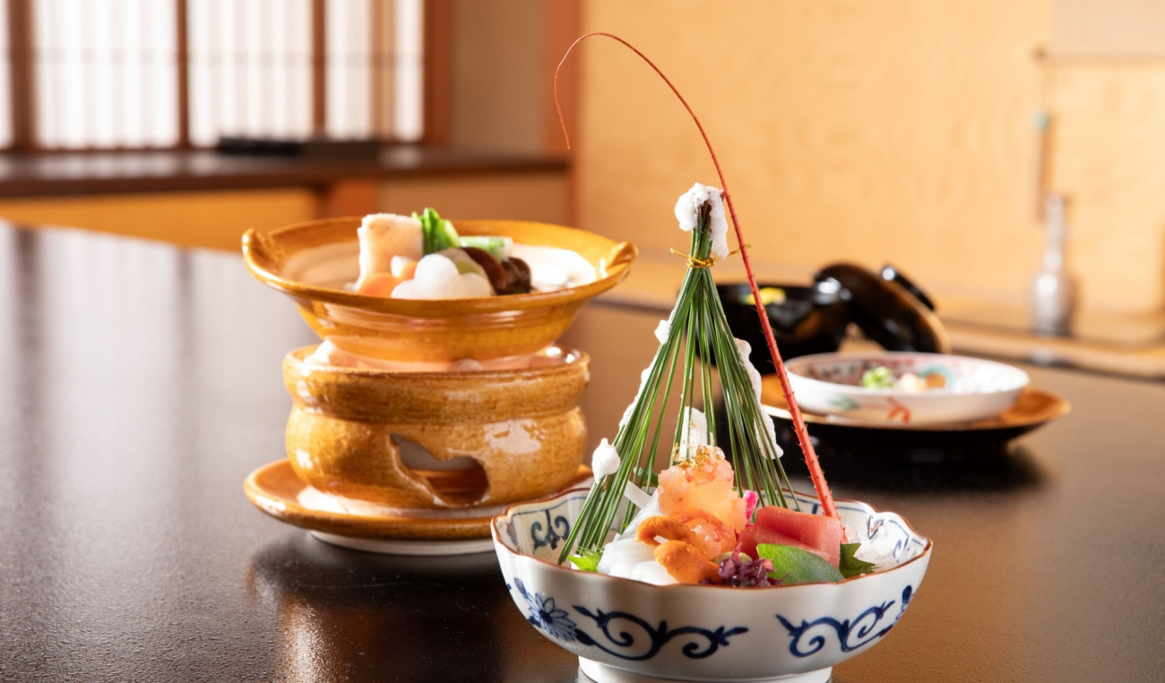 「黄綬褒章」や「現代の名工」など数々の受賞歴をもつ日本料理 うえまち 料理長 茅ヶ迫 正治が、冬の味覚の代表 ふぐ・クエ・蟹などを使用したワンランク上の会席を、2日間限定でご用意します。熟練の技が光る盛り付けと、繊細なお料理をご堪能ください。また、お料理に合う地酒のペアリングもご用意していますので、会席と合わせてお楽しみいただけます