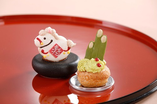 ・門松に見立てたピスタチオとチェリーのシュークリーム