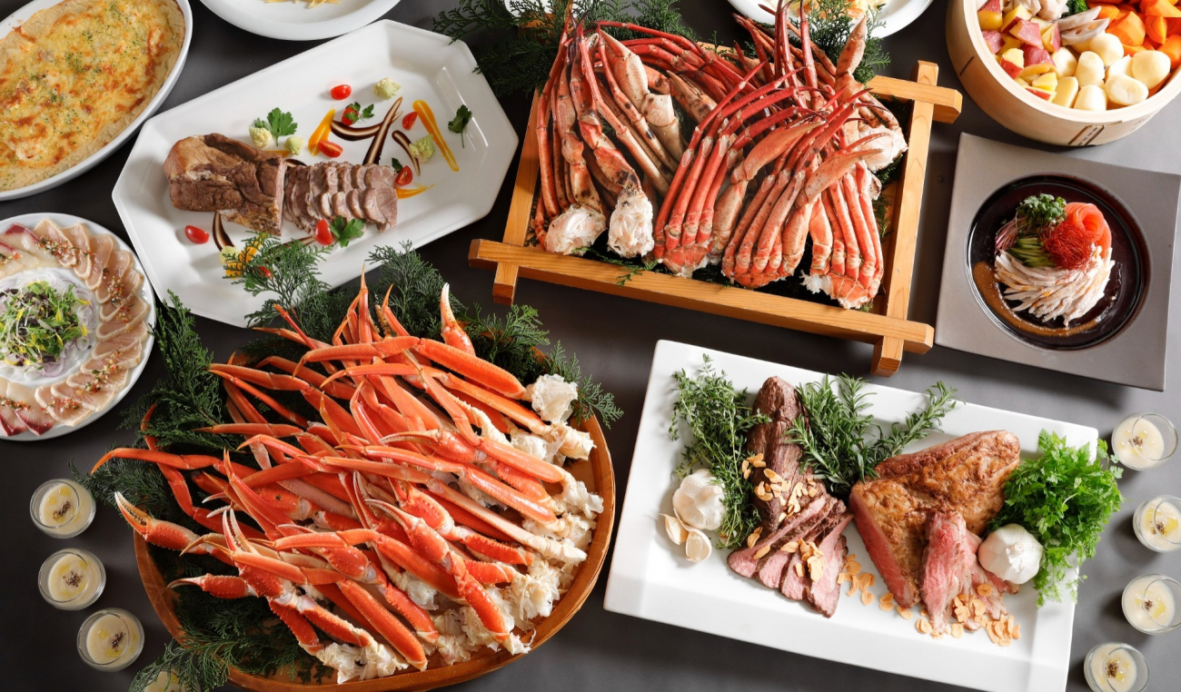 人気メニューの本ズワイ蟹、マルズワイガニ、ローストビーフ2種に加え、海鮮カルパッチョ、玉葱のブルーテ、豚肉のロティ バルサミコとみかんのソースなど新メニューをご用意します。また、柚子と生姜を使用したタルトレット柚子ジンジャーなど、冬におすすめのスイーツもご用意しております。