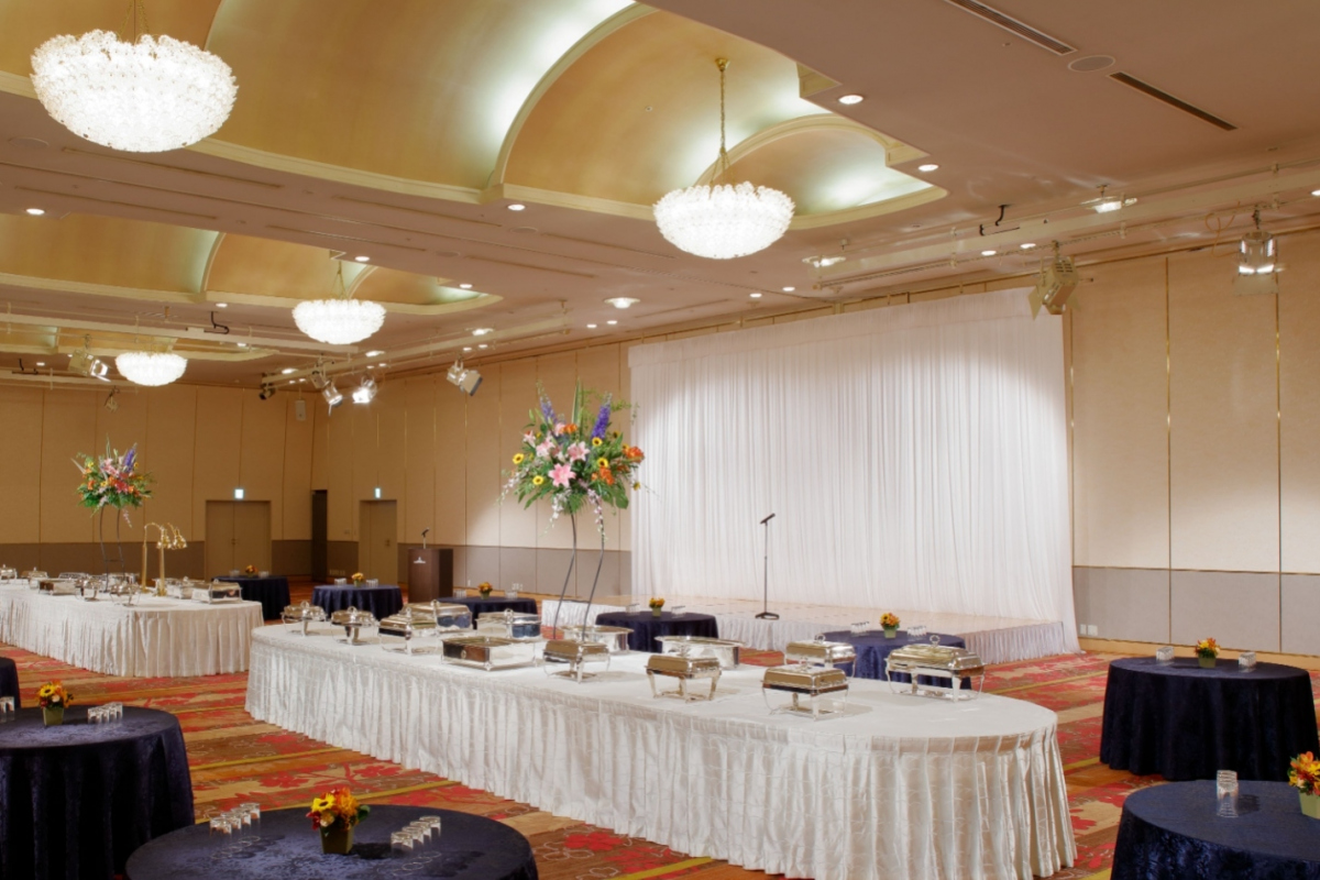 吉野のさくらをイメージしたカットグラスのシャンデリアが特徴の大宴会場です。
