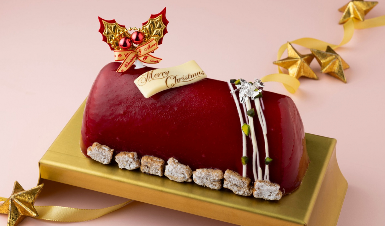 ピスタチオとグリオットチェリーのムースを閉じ込めた真っ赤なブッシュ ド ノエルです。