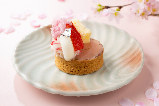ベリージャムを忍ばせたタルトに、レアチーズと桜餡を重ねた一品。桜餡のシャンティや白玉、イチゴ、ほどよい塩味の桜で春の余韻を添えます。