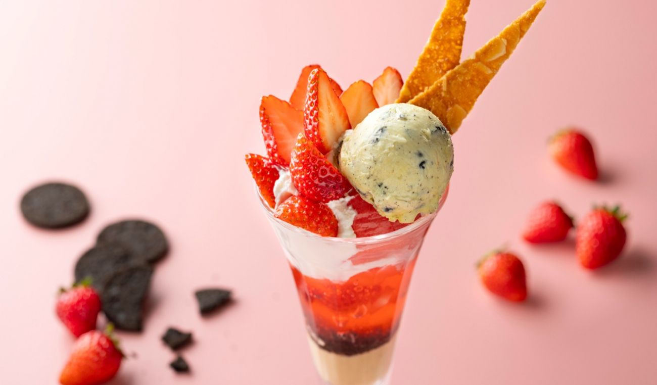 イチゴの甘酸っぱさとアイスクリームの甘さが溶け合うパフェは、クッキーの風味と食感がアクセント。