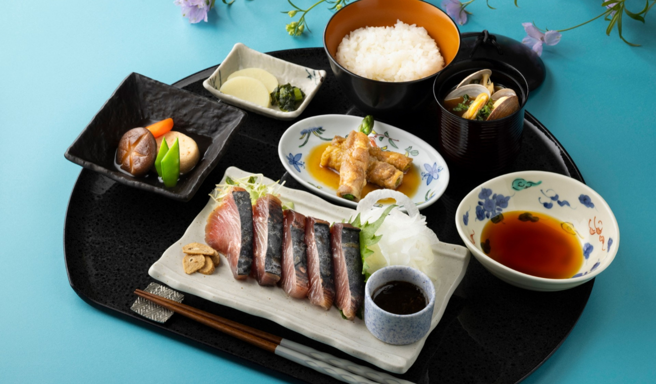 初鰹のたたきを新玉葱のサラダとともに。爽やかな初夏の味覚をお愉しみください。