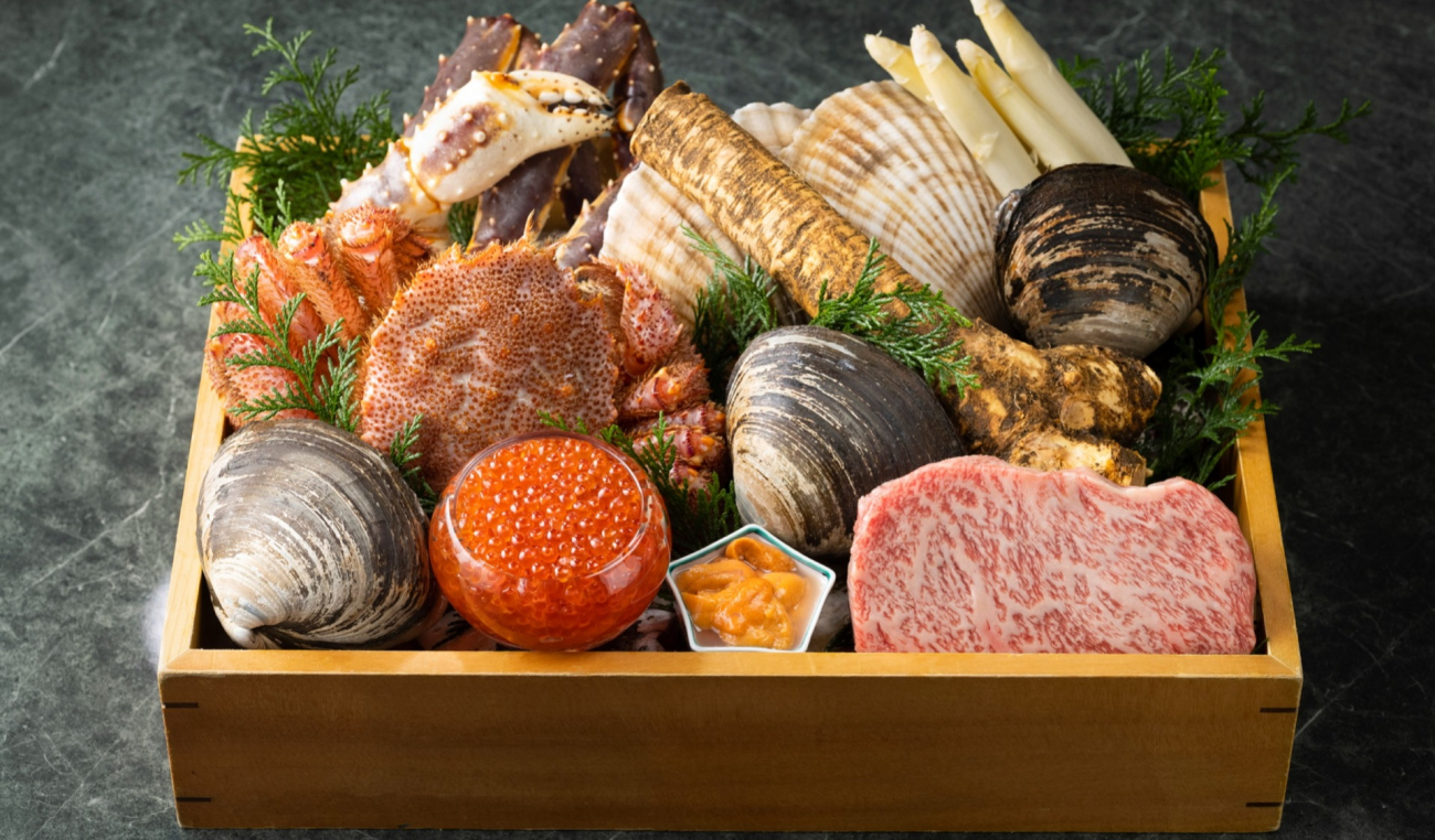 北海道から届いた毛蟹など海の幸、ホワイトアスパラガスをはじめとした大地の恵みを匠の技で季節の逸品に。メインは深くまろやかな味わいの とかちポロシリ和牛を焼き上げます。