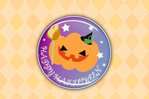 合言葉は「トリック・オア・トリート!」。カボチャの缶バッチ(右画像)をつけたスタッフに合言葉を伝えると、お子様一人につき1個、お菓子を差し上げます。カボチャの缶バッチをつけたスタッフを探してください