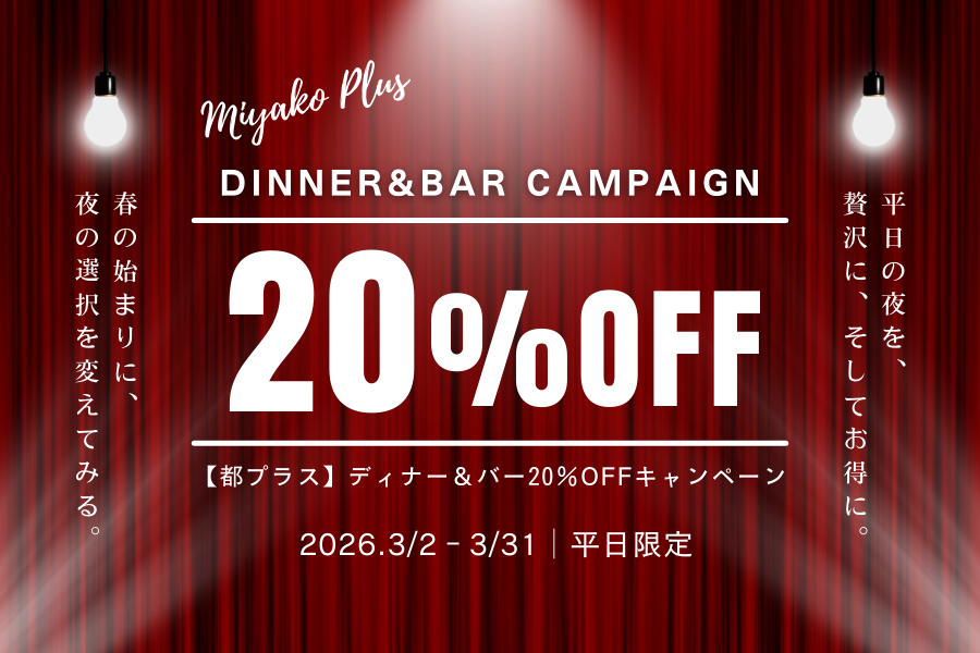 都プラスアプリ会員様を対象に、平日ディナータイム(17:00以降)に1会計10,000円(税込)以上のご利用で20%OFFに。期間中は何度でもご利用いただけます。お仕事帰りの一杯から、歓送迎会や春のご会食、大切な方との特別なひとときまで。ホテルならではの落ち着いた空間と上質な味わいを、いつもよりお得にお楽しみください。