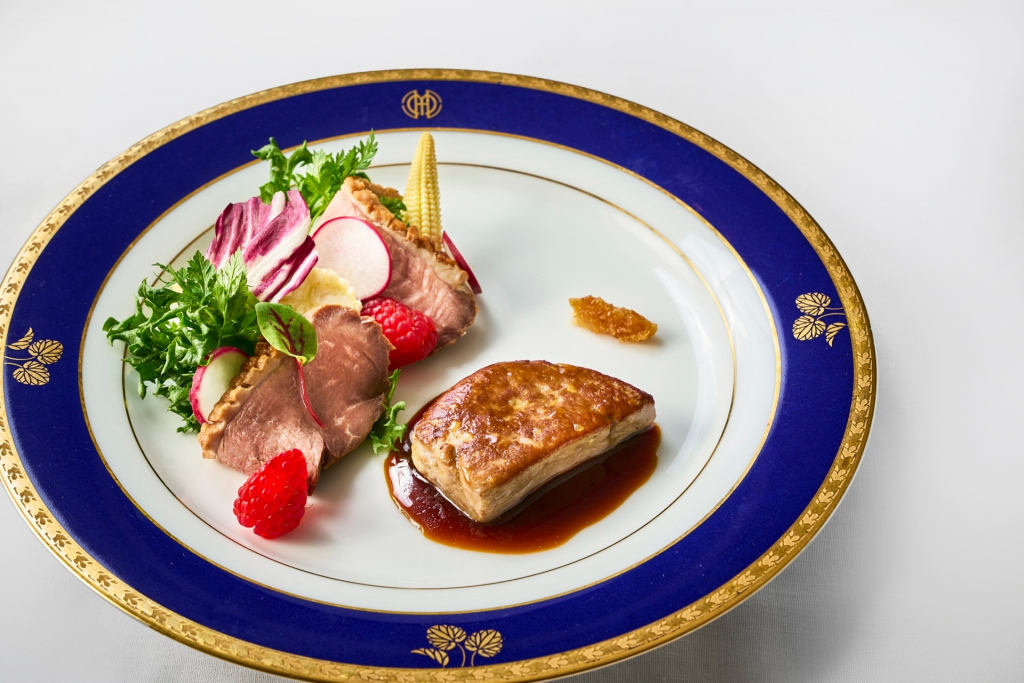 フォアグラのポワレ ソースエーグルドゥースと共に - タピオカと彩り野菜を詰めたコンソメスープ パイ包み焼き