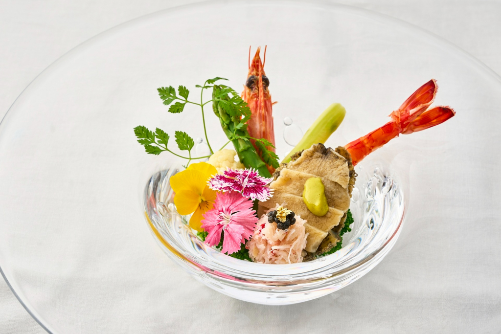 - 鮑 車エビ 蟹と彩り野菜 グリーンマスタードの香り