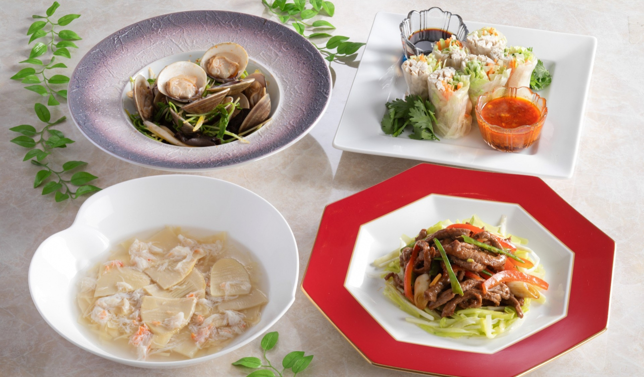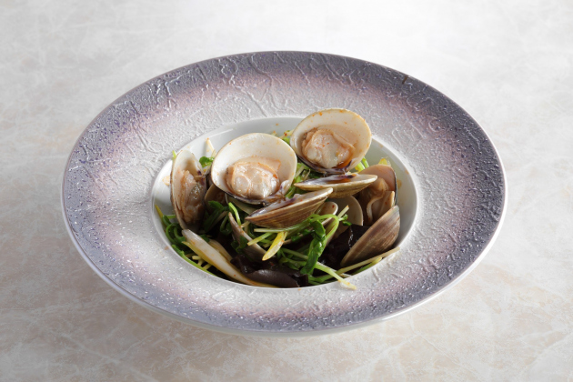 旬の蛤と豆苗を、芳醇な紹興酒とピリリと辛い豆板醤で四川風に蒸し上げました。豆苗のシャキシャキ感と、蛤から溢れ出す濃厚なエキス。旨味が凝縮された蒸し汁まで絶品な、お酒も進む一品です